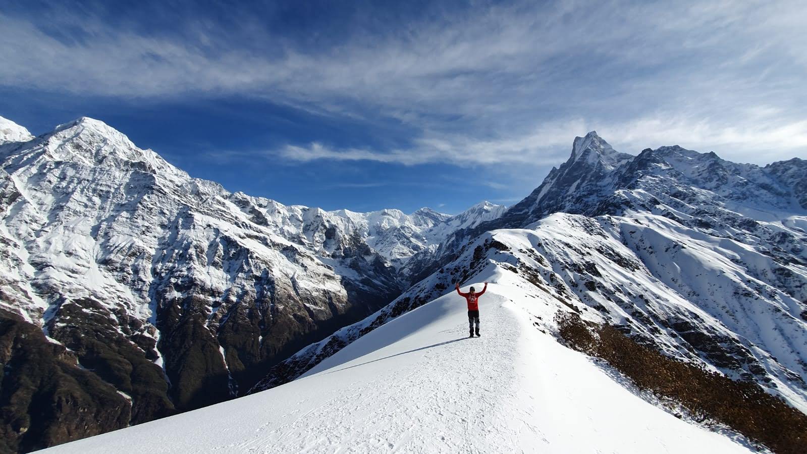 · Close-up views of Mardi Himal, Machhapuchhre (Fishtail), Hiunchuli, and the Annapurna range.